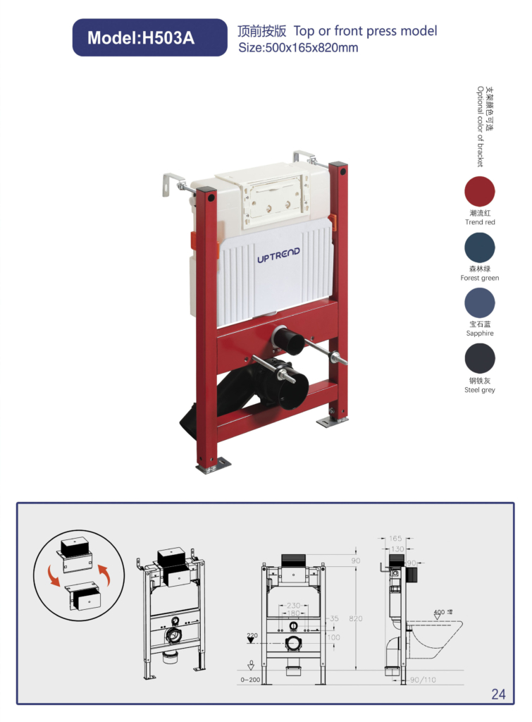 Stelaż H503A to propozycja dla osób, które oczekują niezawodności, stabilności i pełnej funkcjonalności, a jednocześnie chcą zachować spójny, elegancki wygląd strefy WC. Zestaw z przyciskiem UP006 tworzy harmonijną całość, która sprawdzi się w każdej nowoczesnej łazience.
