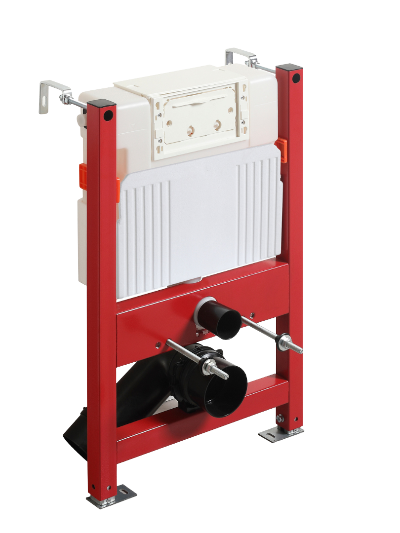 Stelaż podtynkowy H503A to konstrukcja zaprojektowana z myślą o nowoczesnych łazienkach, w których liczy się trwałość, elastyczność montażu i estetyka zabudowy. Model umożliwia montaż przycisku od góry lub od frontu, co daje pełną swobodę projektową i pozwala dopasować instalację do różnych typów ścian oraz zabudów. Stalowa rama zapewnia stabilność i bezpieczeństwo, a zintegrowany zbiornik gwarantuje niezawodną pracę systemu. Standardowy rozstaw montażowy 180 mm sprawia, że stelaż jest kompatybilny z większością misek WC dostępnych na rynku. Kompaktowe wymiary 50 × 16,5 × 82 cm pozwalają na montaż nawet w mniejszych przestrzeniach.